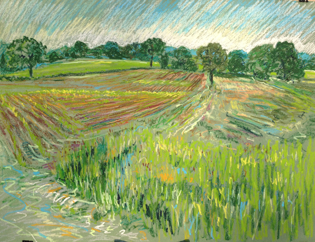Day 167 ............Day 167 ............ I found a great spot to sketch this afternoon on a remote country lane between Hampton Wood and Welshampton. In the time I was there, two cars passed as well as two horse-riders. They stopped for a chat which was nice. I think I'll go back there and paint soon. Oil pastel on blue Ingres paper.